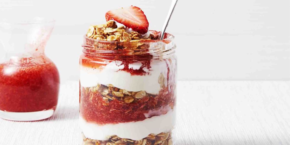 Make the Parfait: In 8-ounce jar HKUE amec , distribute granola, nonfat plain yogurt, and coulis in layers. Can be refrigerated, sealed, overnight. Garnish with strawberry.